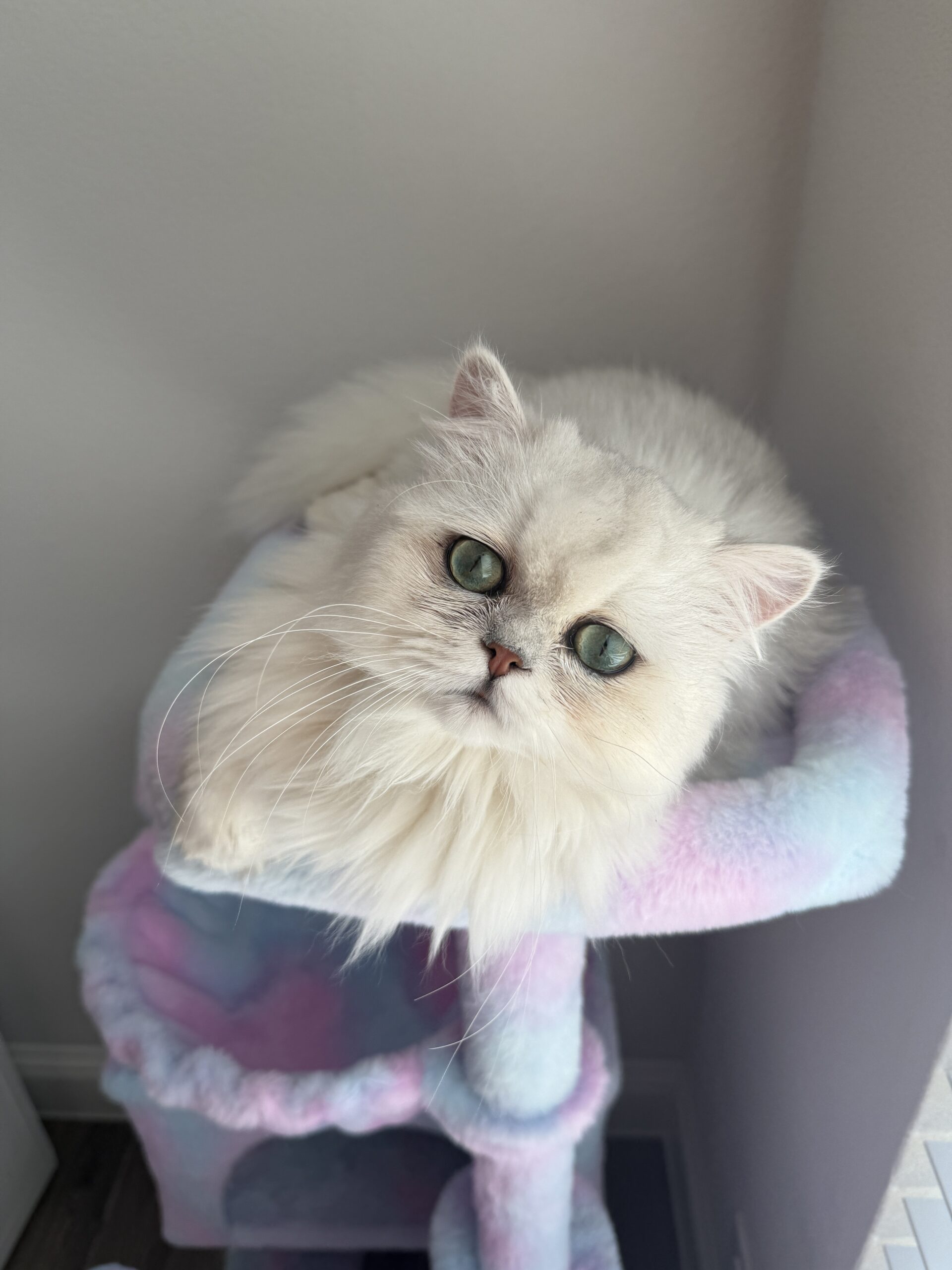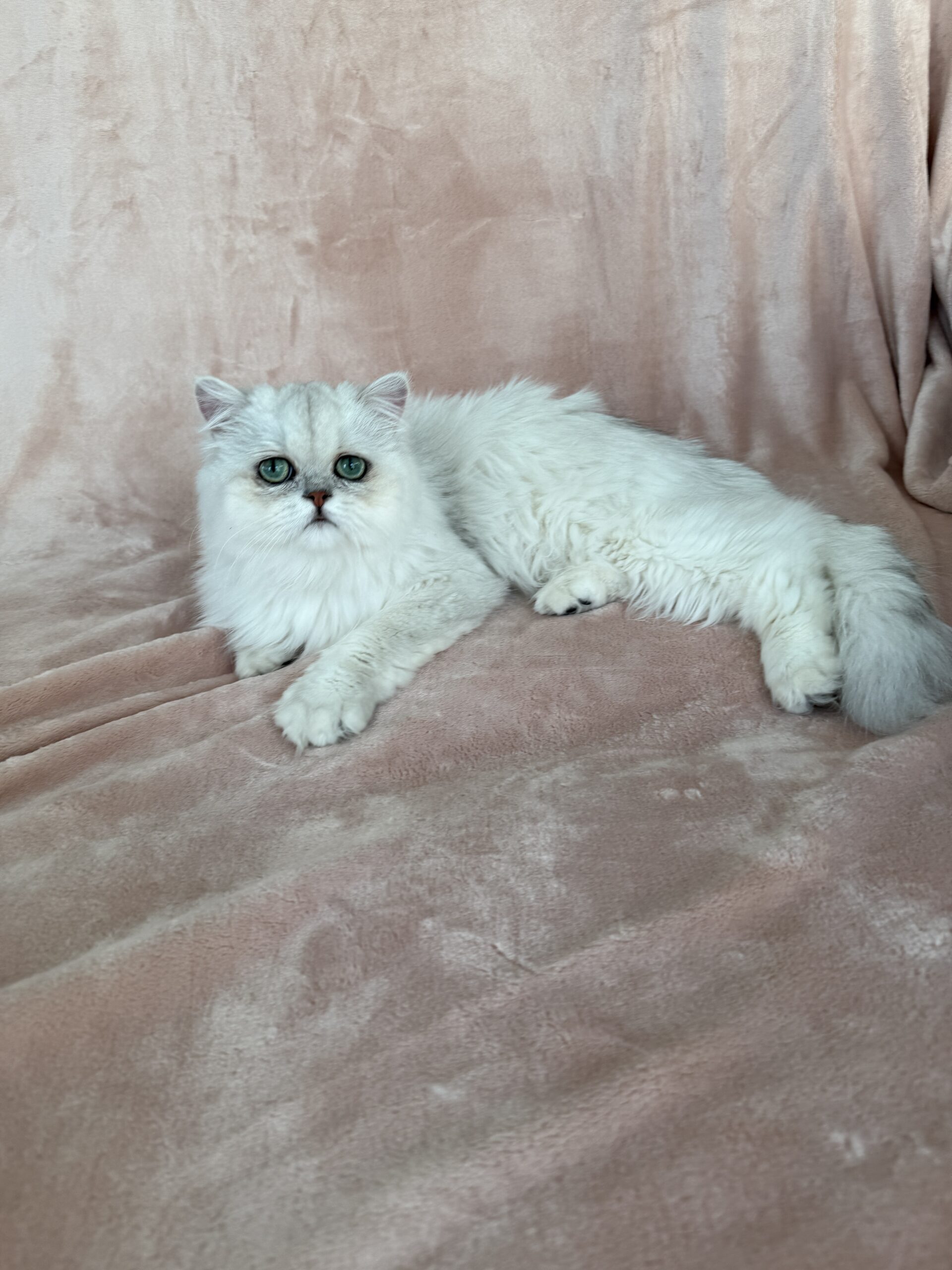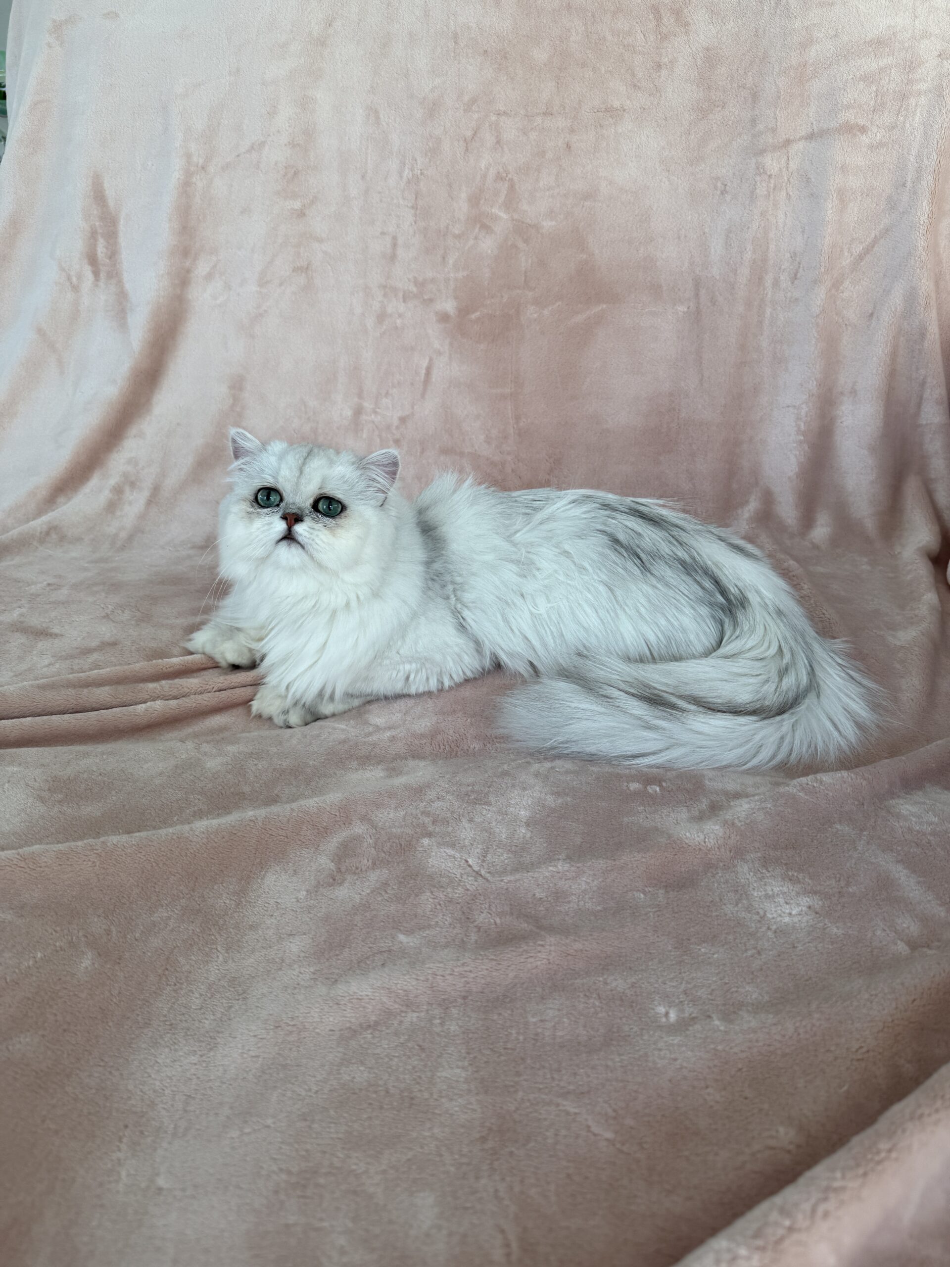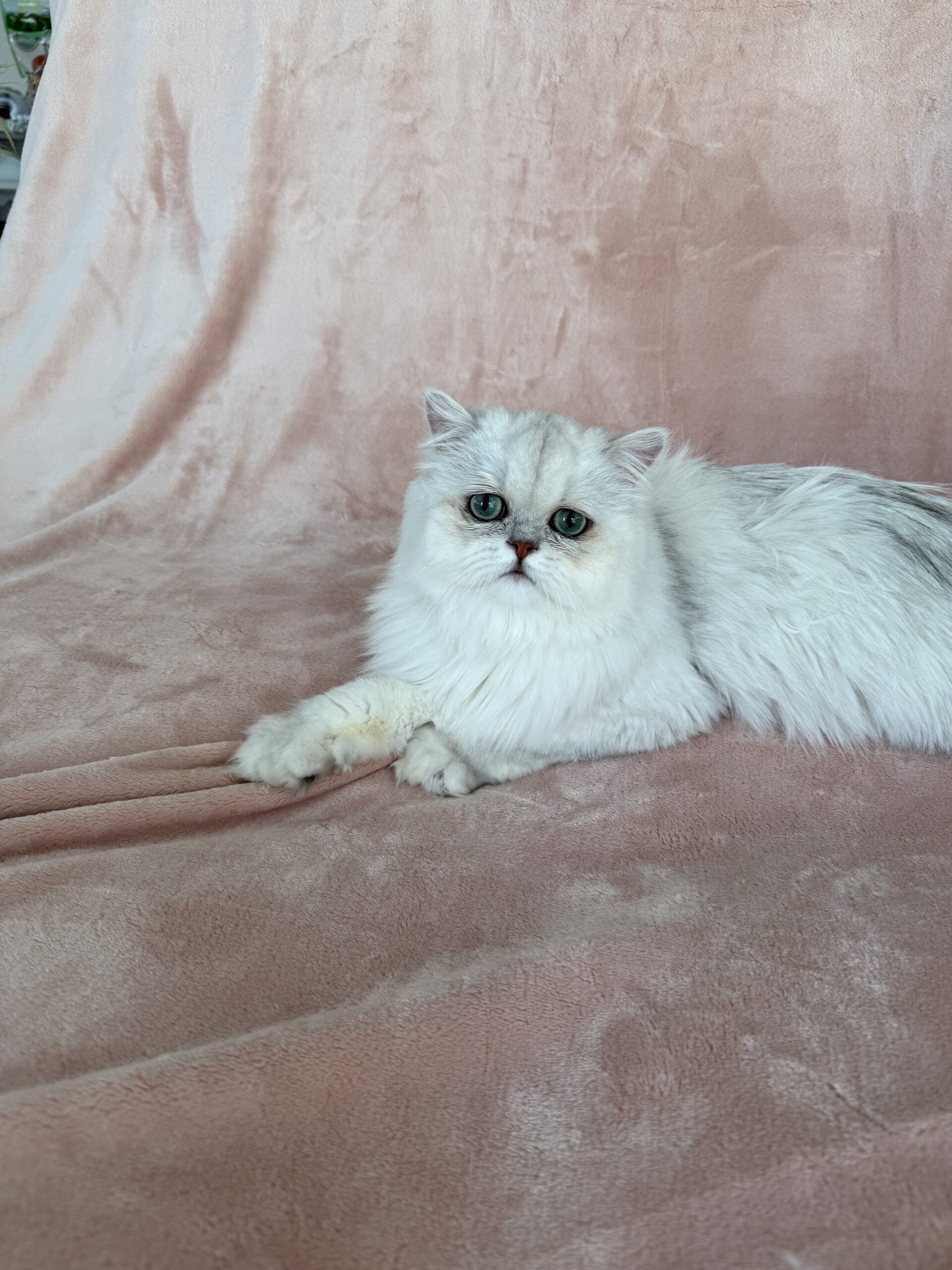 Silver Chinchilla Persians are known for their striking beauty—pale silver coats, black-tipped fur, and a signature black “eyeliner” look around their nose, eyes, and mouth. Their eyes range from green to blue-green, and they often have a more petite build compared to other Persians.